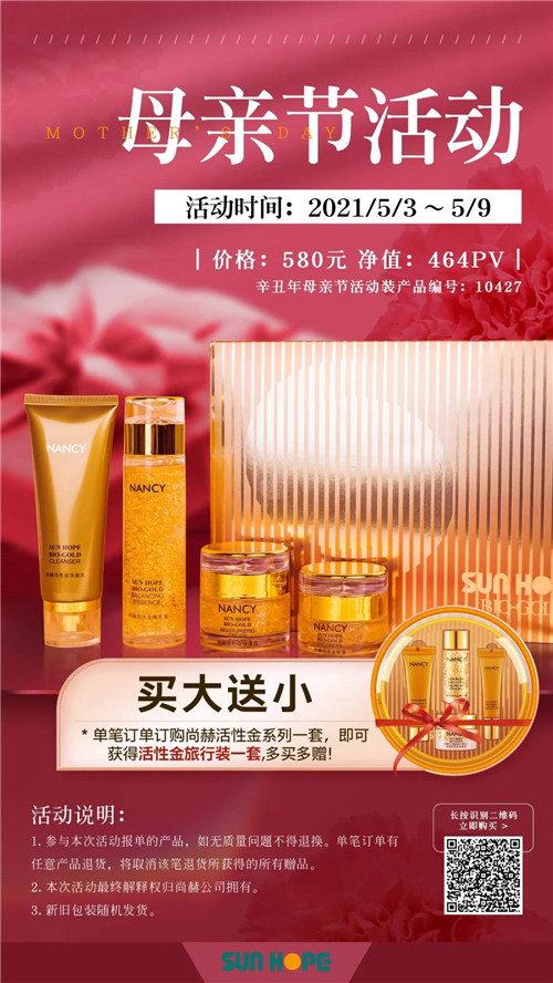 ![]() 【直报网北京5月7讯】(尚赫)母亲, 是能够容纳一切美好的词汇 从我们生命中 第一次的脉动开始 便与她缔结守护的契约, 爱的旅程 她是迎接我们的第一道目光 也是目送我们去远方的 温柔后盾 特·别·的·爱·给·特·别·的·你 五月, 因为有了母亲节 而显得格外温馨 在这个值得感恩的日子里 送尚赫活性金护肤系列 ![]() 给美丽的妈妈 趁时光不老,请多爱她 时光倾吐芳华, 岁月如墨留香。 以爱之名、予此生挚爱 尚赫献礼母亲节 甜蜜活动即将结束 ![]() 花式宠妈妈 特·别·的·爱·给·特·别·的·你 ![]() 2021年5月3日~5月9日 凡单笔订单订购尚赫活性金系列一套, 即可获得活性金旅行装一套, 多买多赠! 数量有限! 赠完为止! ![]() 天下所有的母亲 或许更想看到的是她的孩子拥有了一份靠谱的事业 尚赫家人专属的甜蜜活动 活性金更代表了一份事业 尚赫用产品和爱心、 诚心构筑了企业品牌基础。 尚赫不仅是一份“撒播美丽奉献健康”的事业, 同时也向世人传播着健康的 生活理念与美丽的人生价值。 尚赫平台给无数平凡的孩子提供了一个平台 扩大了格局,找到了人生的价值, 给家人和社会带来更多积极改变。