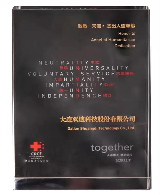 新型冠状病毒肺炎疫情爆发后,双迪迅速启动疫情防控机制,第一时间向全体员工、消费者和社会公众普及疫情防控知识,多次向疫区捐赠防疫物资,践行社会责任。 2020年12月31日,双迪公司收到一份来自中国红十字基金会的特别致谢礼。为感谢双迪公司在2020年2月1日,向中国红十字基金会捐赠的价值300万元空气净化器,用于支持湖北地区疫情防控工作,中国红十字基金会特颁发纪念牌,以作留念。
