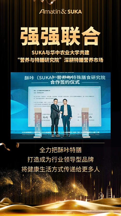 【直报网北京1月25日讯】(SUKA酥咔)喜报 不极致不出品 热烈祝贺 ![]() 为什么要做特膳? 随着物质生活水平的提高,我国居民的劳动强度和饮食结构都发生了较大改变。根据《中国居民营养与慢性病状况报告(2020)》数据显示,我国居民超重率和肥胖率超50%,并且城乡各年龄组居民超重肥胖率呈继续上升趋势,肥胖已经成为诱发慢性非传染性疾病的重要因素! “特殊膳食”是为满足特殊的身体或生理状况和(或)满足疾病、紊乱等状态下的特殊膳食需求,专门加工或配方的食品。这类食品的营养素和(或)其他营养成分的含量与可类比的普通食品有显著不同。 酥咔特膳—用专业树立行业标准 酥咔特膳是唯一获批的体重管理特殊膳食,凭借科学先进的体态管理和健康管理理念,从餐饮指导到生活方式的干预,已经累计为一百三十余万人完成体态美和健康生活方式的改变,热销全球123个国家及地区,带动了整个社会健康水平的提升。 这就是酥咔特膳! ![]() 酥咔特膳——与强者联合 为了形成强有力的行业壁垒,继续深耕特膳,经过慎重筛选,探讨与洽谈,2022年1月5日SUKA与华中农业大学共建“营养与特膳研究院”,达成了合作签约。 华中农业大学食品科学技术学院是一所在华中地区乃至全国具有重要影响力并享有广泛美誉的研究型学院。 2017年全国第四轮学科评估结果中,学院食品科学与工程一级学科被评为A类,并列全国第四。同年,在全球ESI前1%的华中农业大学农业科学学科贡献中,学院在发文数量与被引频次方面贡献最大,分别占全校总数26.83%、25.35%。在学校化学学科进入ESI全球排名前1%中,学院贡献率列第二位。 酥咔(SUKA)营养与特殊膳食研究成立初衷是致力于深入研究中国式肥胖的解决方案,以及研究全营养代餐减脂过程中的技术难点和世界技术瓶颈,为用户健康管理和身体管理赋能。 ![]() 酥咔(SUKA)营养与特殊膳食研究院于2022年1月1日成立! SUKA特膳研究院的成立代表着以全营养,特殊膳食的体重控制方法将迈入新的台阶,特膳研究院将以华中农业大学食品科技学院为依托结合现代食品科技,致力于解决中国式肥胖,使整个体重管理体系更加科学,系统和简便,全力以赴将SUKA品牌打造成体态与健康管理的超级品牌符号。 这一战略举措的完成代表着SUKA始终坚持创新驱动发展战略,不断打造企业核心竞争力,提升品牌硬实力,更高效、更科学地向用户提供优质且全面的健康管理服务! ![]() SUKA(酥咔)用实例证明产品! SUKA(酥咔)用专业打造标准!