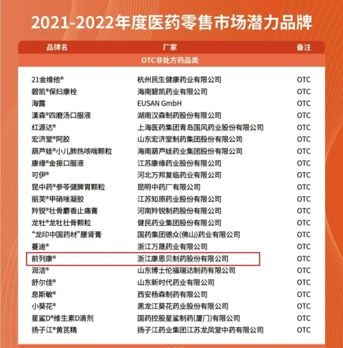 【直报网北京6月8日讯】(康恩贝)近日,由中康科技主办,以“向标外市场要增长”为主题的“2022西鼎会——健康商品交易大会”成功举办。会上,2021-2022西鼎奖·品牌评选结果隆重发布,康恩贝股份公司旗下的肠炎宁和前列康分别入围“2021-2022年度医药零售市场畅销品牌”和“2021-2022年度医药零售市场潜力品牌”。 ![]() 本次大会汇聚了800+来自全国各地的优秀医药企业,2000+优质连锁药店,以及行业内专家等共同参会。西鼎奖·品牌评选由西鼎会组委会发起,在全国范围内遴选一批终端畅销或具备发展潜力的健康商品品牌予以表彰。品牌评选以品牌实力、品牌成长性、品牌可及性为核心指标,建立科学数据模型对入围品牌进行综合评估,最终评选出“2021-2022年度医药零售市场畅销品牌”和“2021-2022年度医药零售市场潜力品牌”。本次评选共有100个品牌上榜,中康CMH数据显示,这100个品牌累计年销售额高达949亿元,占全国医药零售市场近20%的份额。 ![]() ![]() 品牌背后,承载着的是消费者的信赖与认可。康恩贝牌肠炎宁、前列康牌普乐安制剂均是康恩贝大品牌大品种工程的重点品牌,在各自领域的市场占有率位居前列。其中肠炎宁在品牌OTC产品营销和学术推广双向发力下,2021年实现销售收入8.53亿元,同比增长25.73%,在国内中药肠道用药领域占据领先的市场地位。前列康当年创造性地将油菜蜂花粉制剂应用于前列腺疾病的治疗,开创了国内非手术治疗前列腺疾病的先河,并凭借多年来的专业实力和用心服务,成就了泌尿细分领域的优势品牌。 ![]()