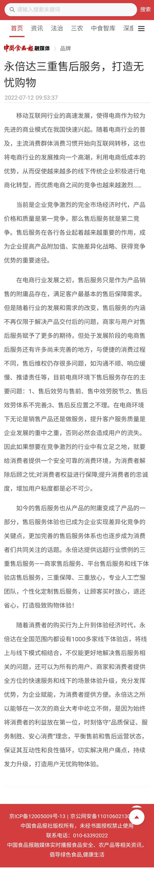 融媒集萃 中国食品报融媒体 永倍达三重售后服务,打造无忧购物 永倍达 【直报网北京7月14日讯】(永倍达)当前是企业竞争激烈的完全市场经济时代,产品价格和质量是第一竞争,那么售后服务就是第二竞争。售后服务在各行各业起着越来越重要的作用,成为企业提高产品附加值、实施差异化战略、获得竞争优势的重要途径。 永倍达提供远超行业惯例的三重售后服务——商家售后服务、平台售后服务和线下体验店售后服务,三重保障、三重放心,专业人工客服团队,个性化定制售后服务,让顾客买时放心,退还省心,打造极致购物体验! 文章来源 中国食品报融媒体 原文如下 ![]() 董事长对上半年总公司各项业务数据做了详细汇报,肯定了大家的努力和付出,并对表现优异的地区给予了高度肯定与赞扬。