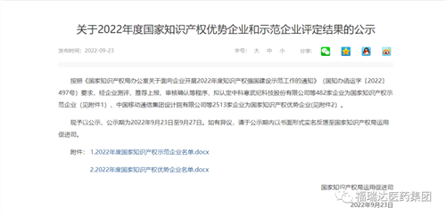 【直报网北京9月30日讯】(福瑞达)近日,国家知识产权局发布《关于2022年度国家知识产权优势企业和示范企业评定结果的公示》,拟认定482家企业为国家知识产权示范企业,明仁福瑞达名列其中。 ![]() ![]() “2022年国家知识产权强国建设示范工作”是国家为贯彻落实《知识产权强国建设纲要(2021―2035年)》和《“十四五”国家知识产权保护和运用规划》的决策部署,加快建设知识产权强国,促进企业提升知识产权综合能力和核心竞争力,打造知识产权强企建设第一方阵而持续推进的一项重要工作。 近年来,明仁福瑞达不断完善知识产权制度,严格落实企业知识产权管理规范,坚持创新驱动发展战略,致力于实现知识产权强企,已于2015年通过知识产权管理体系认证。2017年,明仁福瑞达被评选为“国家知识产权优势企业”,2022年顺利通过复审并入选“国家知识产权示范企业”。截至目前,公司拥有专利67项,其中发明专利29项,实用新型11项,外观专利27项;拥有注册商标210件,马德里注册商标3件。公司注重高价值专利培育,强化高端品牌建设,先后获得“山东省瞪羚企业”“山东省专精特新中小企业”“山东省高端品牌培育企业”等荣誉。