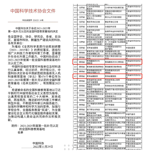 【直报网北京12月6日讯】(金诃藏药)近日,中国科学技术协会发布《关于命名2021-2025年第一批补充认定的全国科普教育基地的决定》,青海省共有14家科普教育基地入选。 经过初评、终评和公示等程序,最终金诃藏药五位一体联盟单位——中国藏医药文化博物馆、青海省藏医院被授予“全国科普教育基地”。 ![]() 中国藏医药文化博物馆是我国唯一以传统藏医药文化为主题的博物馆,馆内设有藏医史、藏族民俗、彩绘大观等十个展厅。 ![]() 自建馆以来始终将科普宣传工作放在首位,充分利用馆内资源,为游客及群众普及相关藏医药科普知识。 利用“全国科普日”“科技周”“博物馆日”“旅游日”等主题日积极开展科普宣传工作,举办免费开放日活动。 同时充分利用网络资源,开通微信、微博与观众互动,巩固了科普宣传的效果。 ![]() ![]() 青海省藏医院作为一所集藏医药医疗、教学、科研、保健为一体的三级甲等民族医院,长期致力于大众科普宣传工作。 在院内设有专门的科普教育场馆、LED广告机、宣传栏进行藏医药知识的科普宣传; 常年利用医院官方微信平台、门户网站定期发布各类科普宣传资料,并设有专门的图书资料室,同时长期与省级媒体(安多卫视)进行合作,通过电视媒体进行广泛科普宣传工作; 针对农牧民地区青少年心理状态加强灌输藏医药健康常识; 利用业余时间编写完成《藏医幼儿乐园》及各种通俗易懂的疾病预防科普宣传册及宣传展版; 常年开展“科普之冬”“名医下乡”“包虫病筛查和牧民健康体检”为主题的义诊活动,开展科普宣传工作。 ![]() 全国科普教育基地由中国科学技术协会认定,目的是充分调动社会各方面科普工作积极性,发挥社会科普资源作用,积极推进科普工作社会化、群众化、常态化,实施“科教兴国”战略和提高公众科学文化素质而设置的称号。