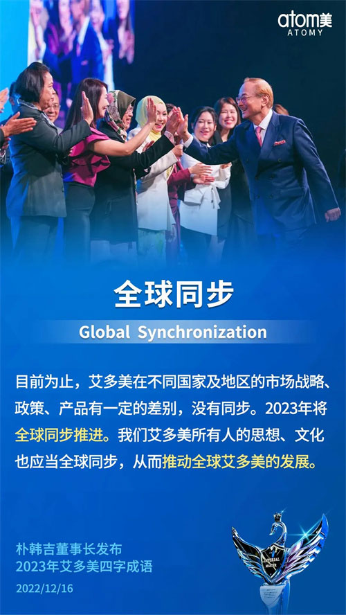 【直报网北京12月21日讯】(艾多美)临近新年,朴韩吉董事长发布了2023年艾多美四字成语:全球同步。艾多美将在新的一年,从产品、市场、政策等方面,都要保持全球共同推进的姿态,尊重并珍爱每一位在全球的经营者、消费者、艾用者,向着全球流通枢纽的势头再进一步!