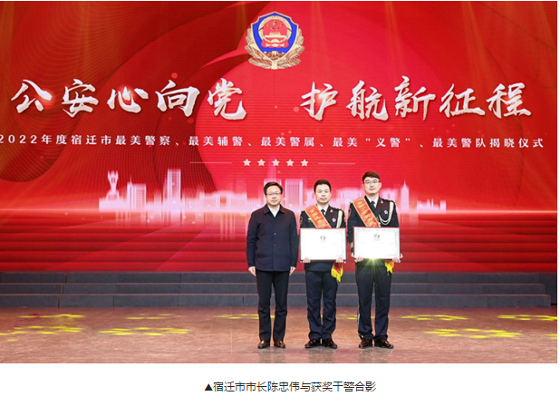 活动现场揭晓了2022年度宿迁最美警察、最美辅警、最美警属、最美“义警”、最美警队名单,表彰了全国公安机关先进集体代表、全国优秀公安基层单位、全国公安机关爱民模范集体、全国公安系统二级英模、全国优秀人民警察、全国公安机关爱民模范。市长陈忠伟,市人大常委会主任、党组书记王益,市政协主席、党组书记冯岩,省公安厅党委委员、副厅长陈旭等领导与金天国际党委书记祖明军及社会各界代表共同上台为获奖者和单位颁奖,并由金天国际党委书记祖明军为最美“义警”荣誉称号获得者颁发荣誉证书。