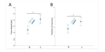 图2.数字模拟显示不同化妆程度的图片素颜(B),口红(L),口红+粉底(LF),口红+粉底+睫毛膏(LFM),不刷睫毛膏+口罩,刷睫毛膏+口罩。 随机选择两组各由8名年龄在18到50岁之间的男女组成的观察评估小组。用“眼动追踪测量”的测试方法,使用眼动仪追踪评估小组在观察图像时的目光运行轨迹,数据分析评估小组成员对不同化妆程度的图像的关注时长和眼球停留时间来判断不同程度化妆的“吸引力”值。 测试结果显示,与素颜(B)相比,涂口红(L)的图像受到了观察小组成员更多的关注和目光停留。与素颜相比,涂口红时注视的时间参数增加了18.1%, 关注度的参数增加了12.6%。涂口红(L)的吸引力比素颜(B)的吸引更大(图3)。