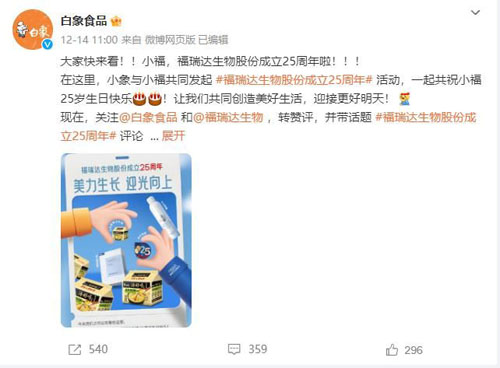 【直报网北京12月21日讯】(福瑞达)“大家快来看!!小福,福瑞达生物股份成立25周年啦!!!在这里,小象与小福共同发起 #福瑞达生物股份成立25周年# 活动,一起共祝小福25岁生日快乐!让我们共同创造美好生活,迎接更好明天!”。12月14-15日期间,包括白象、361°、大众点评、洽洽、上好佳等超过100家品牌微博祝贺福瑞达生物股份25岁生日,横跨食品、互联网、服饰、家居等不同行业,成为微博平台的一道靓丽风景线。 ![]() ![]() ![]() ![]() ![]() ![]() 2023年,是全面贯彻党的二十大精神的开局之年,中国式现代化建设扬帆启航;2023年,福瑞达医药集团成为上市公司主体,阔步迈入“1234”高质量创新发展的新阶段;2023年,福瑞达生物股份再攀业绩高峰,全产业链加速发展,隆重迎来25岁生日。25年风雨兼程、勠力同心,福瑞达生物股份已发展为行业龙头企业;25年牢记使命、努力拼搏,福瑞达生物股份已突破20亿元销售规模;25年匠心不辍、跨越发展,福瑞达生物股份成功打造“4+N”品牌矩阵,构建起了强大的产业链、价值链、创新链、供应链。 “福瑞达生物股份是中国玻尿酸护肤、微生态护肤领域的开创者,成功打造了颐莲、瑷尔博士等多个知名品牌,是国货美妆的重要代表,非常高兴能够参与福瑞达生物股份25岁庆生活动。”蓝V品牌负责人纷纷表示。早在一个月前,战略与品宣管理部就开始谋划蓝V跨界互动活动,与众多蓝V品牌建联,得到了超过150家品牌的积极响应。由于1V1海报设计工作量巨大,最终与100家品牌蓝V成功宣发。