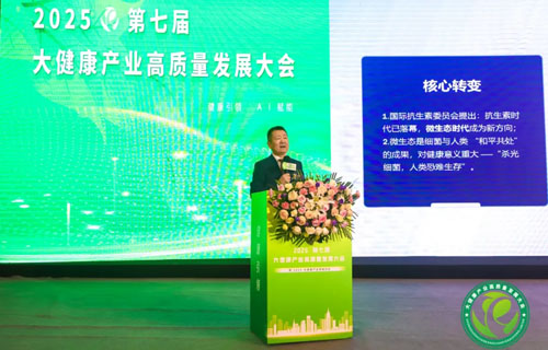 (现场图) 临沂大学教授、临沂大学再生医学创新研究院院长、卫康生物集团董事长王宗继应邀出席,并发表题为《打一场人民健康保卫战》的主题演讲。 作为“科研+产业”双轨践行者,董事长王宗继以“5亿慢病患者”的严峻数据为切入点,提出从“疾病治疗”向“生态修复”转型的破局方向,并公开卫康生物集团的创新实践: 01 技术突破: 依托临沂大学再生医学创新研究院科研优势,牵头攻关肠道微生态诊疗关键技术,构建“寡糖生物+蒙山医养+再生医学”产业格局; 02 方案创新: 推出“精准肠道菌群移植技术”与“清养补抗调”五位一体健康方案,将肠道健康管理从医疗场景延伸至家庭生活; 03 范式转变: 实现从“被动治疗”到“主动调菌”的健康管理转型,为慢病防控提供可复制的“中国方案”。