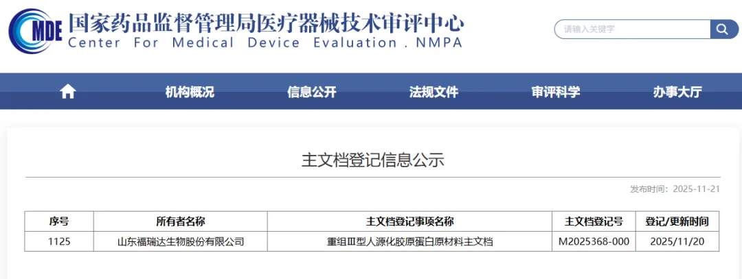【直报网北京12月1日讯】(福瑞达)近日,国家药品监督管理局医疗器械技术审评中心官网公示,福瑞达生物股份研发的植入级别的重组Ⅲ型人源化胶原蛋原材料成功完成主文档登记(主文档登记号:M2025368-000)。这一突破性成果不仅标志着福瑞达生物股份在高端医疗器械原材料领域实现关键进阶,更成为其“生活美容+医学美容”双美产业生态建设的核心支点,为双美业态的高端化、一体化布局打通了从核心原料到终端场景的关键准入通道。 ![]() 福瑞达生物股份研发的重组Ⅲ型人源化胶原蛋白,是基于人体的胶原蛋白氨基酸序列,定向构建高表达底盘细胞,通过高密度发酵及多级纯化获得,有活性点位更多、水溶性更好、生物安全性更高等特点,可满足高端医疗器械产品的临床需求。本次完成主文档登记的重组Ⅲ型人源化胶原蛋白原料具有高纯度、低内毒素、低免疫原性等特点,具有去除疤痕、增强皮肤弹性、修复受损皮肤、促进伤口愈合、减轻皮肤炎症等活性,可作为面部真皮组织填充、面部注射等植入医疗器械的核心原料。 根据福瑞达生物股份相关计划,该原料主要用于公司旗下医疗器械产品的研发与生产,同时在医疗美容及创面修复领域进行多个产品开发布局。未来将与福瑞达生活美容板块的护肤品、院线产品等形成互补,为消费者提供从专业医学美容干预到日常护肤养护的全周期、一体化解决方案。