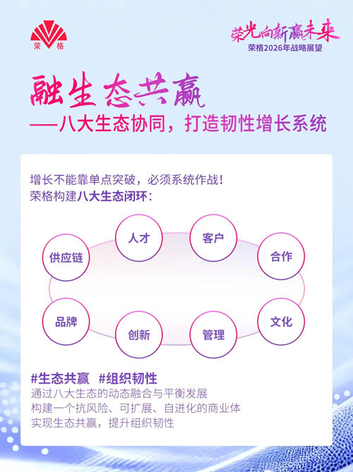 【直报网北京12月18日讯】(荣格)12月15日,我们共同见证了荣格发展史上又一重要时刻——“荣光向新·赢未来——荣格2026年战略展望会”隆重召开。会上,荣格对2026年发展战略、品牌战略及人才战略进行展望,为未来的前行之路,锚定新的方向。 荣格科技集团总裁、荣格科技总经理张阳辉先生在会上发表重要讲话,他提出荣格2026年要围绕“全场域营销·融生态共赢·高质量发展”的核心纲领,全面推进企业战略升级。 今天,让我们一起通过图解来展望这三大战略支柱——从“全场域营销”如何重塑用户连接,到“融生态共赢”怎样构建组织韧性,再到“高质量发展”如何引领我们走向世界级舞台。 荣格2026年战略展望 ![]() ![]() ![]() ![]() ![]() ![]() 2026,荣光向新赢未来! 2026,是全新的起点。 “荣光向新·赢未来”——这场变革,关乎产品,更关乎生态;关乎增长,更关乎责任;关乎今天,更关乎百年。 未来的荣格,将是一个——有温度的品牌、有韧性的组织、有格局的平台、有信仰的共赢体。 让我们携手并肩,以战略为帆,以信念为舵,在高质量发展的浪潮中,共创健康文明,共赴星辰大海!