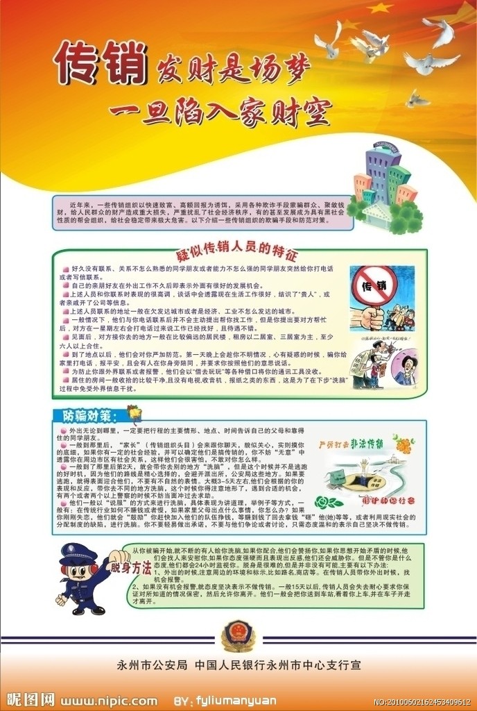 直报网北京2月4日电(中国工商报报道)2011年以来,青海省工商机关坚持打击与防范并举,加强打击传销宣传攻势,开展了“珍爱家庭,远离传销”宣传活动,完善打击传销长效机制,全面推进打击传销规范直销工作深入开展。 针对当前一些传销组织变换手法引诱和欺骗急于求职的农民工、学生参加传销的实际情况,青海省工商局根据当地经济社会发展特点,有针对性开展宣传活动。同时,该局还编印了配以漫画插图的藏汉两种文字的防范传销知识宣传手册15万份,下发给全省各地用以开展宣传活动。 海南藏族自治州工商局协调青海师范大学,把创建“无传销校园”纳入“平安校园”建设主要内容,在该校开展了由450多名大学生参加的“珍爱家庭,远离传销”宣传活动。贵南县工商局在该县中学举办了打击传销违法犯罪活动法律知识讲座,兴海县工商局组织该县400多名中学生参加了抵制传销宣誓活动。 为了增强群众抵制传销、远离传销的意识,海西蒙古族藏族自治州工商局集中开展了打击传销、规范直销“六进五查”专项活动。格尔木市工商局举办了由宣传人员、企业、个体工商户、群众代表共计2000人参加的“抵制传销”千人签名活动。西宁市工商局深入社区开展宣传活动,通过以案说法、发放宣传资料、展示宣传漫画、悬挂横幅等方式,执法人员现场向群众讲解传销的本质,揭露传销的欺骗性和危害性。贵德县工商局开展“反传销宣传车乡村行”活动,组织辖区2700多名群众收看了反传销电影《黑梦》。黄南藏族自治州工商局用藏汉双语宣传打击传销成果,同德县工商局在县城、乡镇和村社张贴、发放2000余份藏汉双语印制的“给农牧民群众的一封公开信”。 针对打击传销工作实际,青海省工商机关注重完善各项打击传销工作机制,建立了举报传销活动奖励机制、执法人员快速反应机制、部门协作配合机制以及信息交换平台和联动机制。 此外,青海省工商局指导全省各级工商机关联合当地公安机关开展了对出租屋、城乡接合部的全面清理排查工作,严厉查处传销大要案件。截至目前,全省工商系统共出动执法人员934人次,捣毁传销窝点9个,立案查处传销案件3起,教育遣返参与传销人员324人。▲ |
