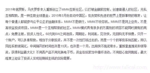 既然许诺了月收益在30%,那么这30%是从哪里来的呢?不知道。月收益哦!一年就是360%! 看完了所有介绍,不知道这多的360%是从哪里来的。 如果我简单翻译一下它的介绍,过滤掉所有与项目本身无关的文字,那就是 你把钱打给另一个人,然后每个月拿到30%的回报,一年360%的回报。 ....凭什么?还有一个很有意思的规定就是限额6万,过了6万会被封号(邪教组织吗)。为啥规定不能超过6w呢,我觉得原因可能有: 1.他们就是想清楚了,专门欺负穷人,太有钱的人万一崩盘惹到谁了不好交待啊。 2.钱少才容易用之前募集(pian)来的资金付利,钱太多利息高了之后这个击鼓传花的游戏怕玩不下去。 3.6w以下的朋友觉得自己最多也就6w有风险,损失了也不会为了这件闹事。 4.这部分的群众更容易有不劳而获的心态? 为啥这么多人热衷于发展下线? |
