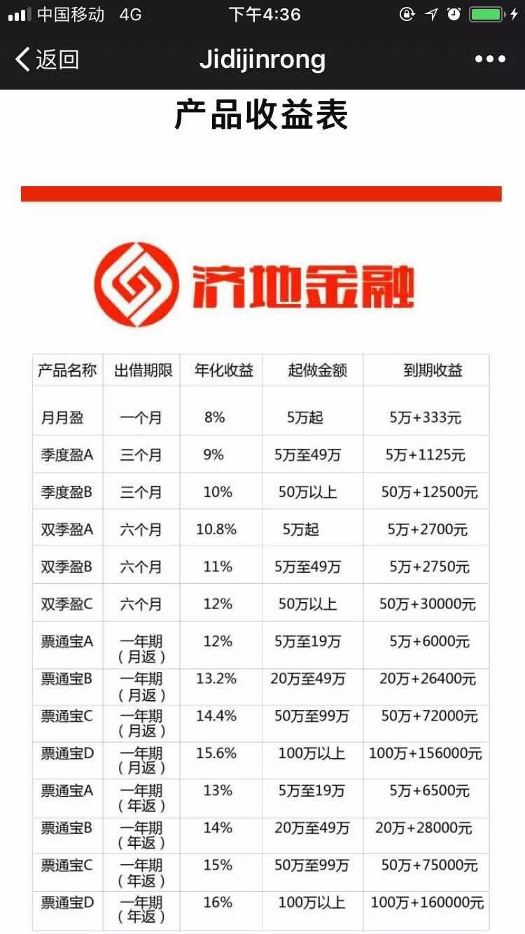 谁被坑了 在场的两位奥森会员告诉《国际金融报》记者,济地员工同样也被拖欠了两个月工资。而通过天眼查等网站,记者发现,济地金融是最高人民法院公示的失信公司,于2017年6月被南京市六合区人民法院要求向申请人支付产假工资,然而全部未履行。 ![]() ![]() ▲ 图片来源:天眼查 一方面,是当成集团(奥森、济地)旗下25家公司逾九百名员工被欠薪,奥森十几万(不完全统计)会员千万以上会员费下落不明,另一方面,济地金融的投资人,也再难找回自己的血汗钱。 ![]() ▲ 图片来自济地金融公众号,其曾举办带客人旅游古镇的活动,客人以老年人居多 沈先生表示,就他所知,共和国际处的奥森会员有很多被劝说购买了济地的理财产品,尤其在近几个月,济地销售人员的推销力度相当大。 “那些老头老太是真的惨啊,被这些手段骗得……投了上百万的,我就见到好几个,全部都在哭。”邓总监曾因员工讨薪去济地金融,看见许多老人在哭。而根据那些老人的说法,济地金融吸引他们购买理财产品时,宣称的年化收益率高达18%,并且可以当场返现。 ![]() 根据济地金融公众号的宣传,其明星产品为票据理财产品“票通宝”,其一年期产品最高可达16%收益率。