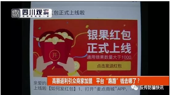目前,商家们已经报警,警方对此事也在进一步调查,对于商家们遇到情况,记者也是咨询了律师。律师表示,天上没有掉馅饼的事,从节目反馈来看,这些商家很有可能是遭遇了一个电信诈骗或者网络诈骗。所以他建议大家应该团结起来,选出维权代表,第一时间向辖区派出所或者是公安机关进行报案,通过公安机关的积极破案,追回赃物来返还所有的商家。第二点,从律师支招的角度来说,我们的网络时代比较发达,但是现实和网络是不对称的,特别是对于那种所谓的虚拟货币也好,网络平台也好,充值返现也好,大家一定要提高警惕,不要因为自己的轻率,或者为了贪图一些销售额的增长,或者是为了贪图其他便宜,使自己上当受骗。 (原标题:四川成都“麦点商城”平台跑路 警方已介入调查) 责任编辑:小宇 解读新闻热点、呈现敏感事件、更多独家分析,尽在以下微信公号,扫描二维码免费阅读。
