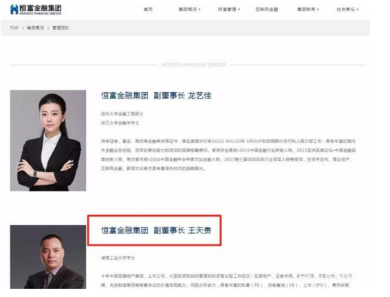 成“老赖”常客 资料显示,恒富金融集团董事长兼法定代表人为王富贵。根据工商信息,王天贵、王富贵分别持股70%与30%。不过,该公司官网并未对王富贵相关信息进行披露。目前,恒富金融集团官网也下线了该公司副董事长龙艺佳等人相关资料介绍。