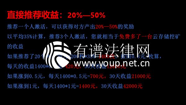 ![]() (贺勇) ![]() (李万元) 【直报网北京8月27日讯】(有谱法律网)今天下午,有耒阳市民向有谱法律网报料称,在耒阳神州明珠大酒店举行了一场号称“新经济创新论坛”的活动,但现场所推出的项目疑似传销,有谱法律网调查后发现,这个名为“TOT油茶通证”确实涉嫌传销。 “TOT油茶通证”由湖南元天科技发展有限公司运营,然而背后实际操盘的是“神农国油”,对外站台的为湖南神农油茶科技有限公司,而这家企业关联的则有湖南神农国油生态农业发展有限公司。“TOT油茶通证”向有谱法律网介绍,投资人用钱买数字货币“TOT”,然后用10000枚“TOT”购买一台矿机进行“采矿”。 矿机挖矿收益在0.03%到99%不等,按照“TOT油茶通证”的说法保守平均每天收益200枚“TOT”,一个月就可以收6000枚。按照该公司的宣传,“TOT”为只涨不跌的数字货币,如果这些收益的“TOT”涨到1块一枚再卖掉,一个月一台矿机可以赚6000块钱,按币价为0.3元每个则购矿机所需的10000个“TOT”只需要3000元成本。 不光采矿,“TOT”向有谱法律网(www.youp.net.cn)介绍说,投资人可以拉人做市场,拉一个人购买矿机可以获得被推荐人产出的20%到50%的收益。按照平均35%的推荐收益,只需要推荐3个人就相当于新购买了一台矿机。如果拉20个人进入,一个月光推荐收益就可以获得42000元。不仅如此,有谱法律网还了解到,投资人拉人头超过20人,该公司还会赠送团队总收益5%到15%不等的额外奖励。 ![]() (币价只涨不跌) ![]() ![]() ![]() (收益模式) “TOT”的客服宣传,该数字货币发行价为0.05元每个,目前已经上涨了10倍。宣称“投资少,收益暴力,推荐奖励更丰厚,真正的躺赚模式,所有收益按24小时结算,相当于0风险投资。”的“TOT油茶通证”到底可以赚多少钱?按照官方宣称,投资人花3000元购买一台矿机后,个人收益加上拉人头收益和团队奖励,一个月可以赚到93000元!