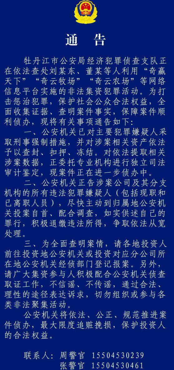 【直报网北京8月18日讯】(牡丹江市公安局经侦支队)牡丹江市公安局经济犯罪侦查支队正在依法查处刘某东、董某等人利用“奇赢天下”“奇云牧场”“奇云农场”等网络信息平台实施的非法集资犯罪活动。为打击惩治犯罪,保护社会公众合法权益,全面收集证据、查明案件事实,保障案件顺利侦办,现将有关事项通告如下:公安机关已对主要犯罪嫌疑人采取刑事强制措施,并对涉案相关资产依法予以查封、扣押、冻结。对依法提取相关涉案数据,正委托专业机构进行独立司法审计鉴定,现案件正在进一步侦办中。 公安机关正告涉案公司及其分支机构的所有违法犯罪嫌疑人(包括现职和已离职人员),尽快主动到归属地公安机关投案自首、配合调查,如实供述自己的罪行,积极退缴违法所得,争取依法从宽处理、为全面查明案情,请各地投资人二前往投资地公安机关或投资对应分公司所在地公安机关经侦部门登记报案。另外,请广大集资参与人积极配合公安机关侦查取证工作,不信谣、不传谣,通过合法、理性的途径表达诉求,切勿组织或参与各类非法聚集活动。
