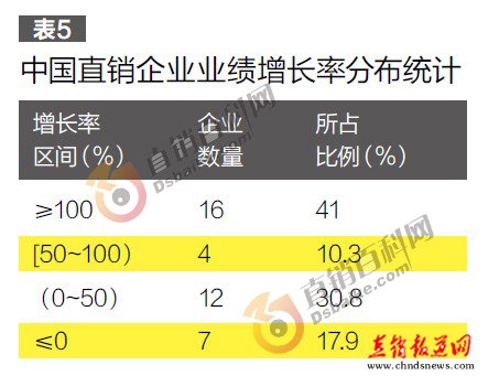 如果用增长率来看,中国直销企业这一年的表现就更为瞩目。有16家企业的业绩增长率超过100%,占所有已启动市场企业的41%,另有4家企业实现了50%~100%的增长,12家企业实现50%以下的业绩增长。(参见表5)