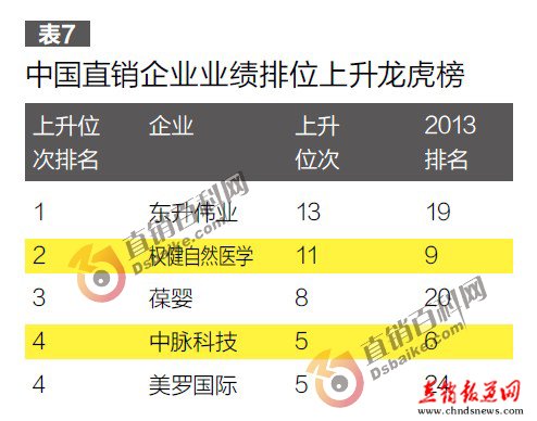 在以上情况的拉动下,直销企业的排位也发生了明显变化。因获牌的利好拉动,东升伟业的业绩排名直升13位到了第19位,权健暴升11位到了第9位,葆婴也净增8位升至第20位,中脉和美罗国际则上涨5位,双双进入上升位数最多的企业行列。(参见表7)