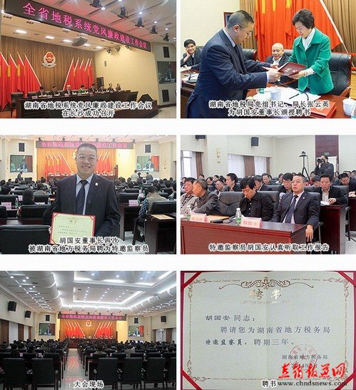 自2008年受聘,2011年连任湖南省地税局特邀监查员以来,胡国安董事长始终认真履行职责,了解和反映基层税务部门和税务人员依法治税、依法行政的情况,在解决群众关心的热点难点问题,促进行风政风建设方面取得了瞩目的成绩,得到了地税系统领导的高度肯定和一致好评。此次会议,胡国安董事长再一次被聘为特邀监察员,成为唯一一位连续两次受聘连任湖南省地税局特邀监察员的企业家。