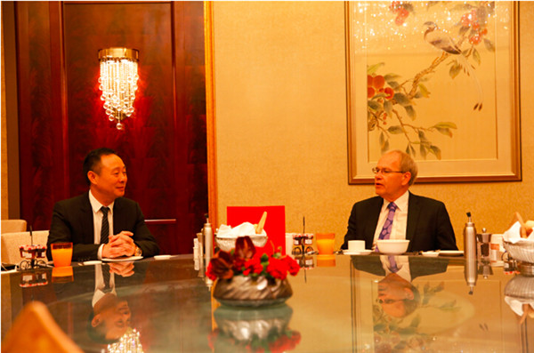 图为:奥克兰市长林•布朗与三生(中国)董事长黄金宝在早餐会上愉快交流