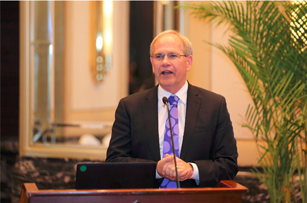 图为:奥克兰市长林•布朗在商贸见面会上介绍当地投资优势