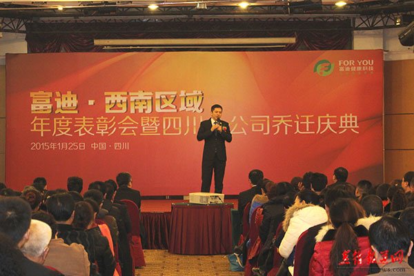 【直报网1月27日讯】(富迪)随着富迪健康科技有限公司四川分公司业务量的增加、人员规模的扩大,经过全面规划及精心筹备,富迪四川分公司于2015年1月25日正式搬入新址。美国富佑集团副总裁韩治国先生,富迪健康管理学院副院长沈堂仁先生,富迪营运副总裁张菡女士,富迪营运中心副总监熊杨琴女士,长成国际商学院教育总监高翔先生,富迪西南区域总监曹杰先生,资深经销商陈文宇先生、于淼先生、郑珊珊女士、唐佳华先生等集团公司高管和市场精英以及西南区域700多位富迪家人参加了此次盛会。 富迪四川分公司新址地理位置优越,交通方便,环境安静;办公室内宽敞明亮、整洁干净,设有公司展厅,清新、雅致、时尚、大方,充分的展示了公司形象;办公区域分别设置经理室、业务室、洽谈室等多个功能室,得到了集团公司和市场领导的一致好评。 25日上午10点,四川分公司进行了开业揭幕仪式,公司高管及四川100多位家人参加了揭幕仪式,公司高管对四川分公司开业致以祝贺并致辞! 乔迁当日,还举行了富迪西南区域表彰庆典。下午2点,会议在家人们热切的期盼中拉开帷幕,富迪营运副总裁张菡女士首先对四川分公司开业表示祝贺;韩治国副总裁对即将推出的3838计划、微整形等项目作了深入解读。他相信,这些新产品与新项目都将为富迪家人今后的事业发展提供更为广阔的发展舞台;沈堂仁副院长在发言中阐述了公司将在大数据、大互联网、大直销、大资本运营四网联动的基础之上,推进多元化产品经营及公司的产品优势;高翔先生表示公司商学院将是所有家人的坚强后盾。场内掌声不断,高潮迭起,家人们纷纷表示:富迪公司未来的发展蓝图,在增强经销商对富迪公司的认知和信心的同时,又为四川市场的后续发展注射了一剂强心针。 |