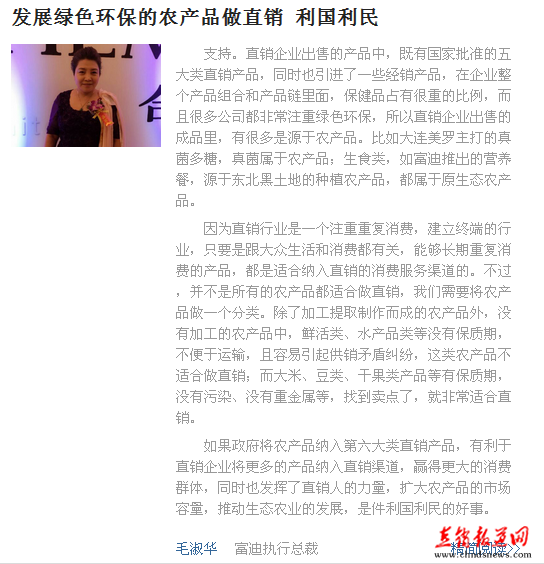 【直报网4月27日讯】(富迪)日前,直销道道网和直销博客网两大行业媒体,邀请包括富迪健康科技有限公司执行总裁毛淑华女士在内的多名直销企业高管、行业专家导师、市场精英,围绕“农产品将成为第六大类直销产品?”为这一热点话题,进行深度探讨和讨论。 毛淑华女士认为,现在很多直销公司都非常注重绿色环保,所以直销企业出售的成品里,有很多是源于农产品。如果政府将农产品纳入第六大类直销产品,有利于直销企业将更多的产品纳入直销渠道,赢得更大的消费群体,同时也发挥了直销人的力量,扩大农产品的市场容量,推动生态农业的发展,是件利国利民的好事。 以下是毛淑华女士观点全文: 发展绿色环保的农产品做直销 利国利民 直销企业出售的产品中,既有国家批准的五大类直销产品,同时也引进了一些经销产品,在企业整个产品组合和产品链里面,保健品占有很重的比例,而且很多公司都非常注重绿色环保,所以直销企业出售的成品里,有很多是源于农产品。比如生食类,如富迪推出的营养餐,源于东北黑土地的种植农产品,都属于原生态农产品。 因为直销行业是一个注重重复消费,建立终端的行业,只要是跟大众生活和消费都有关,能够长期重复消费的产品,都是适合纳入直销的消费服务渠道的。不过,并不是所有的农产品都适合做直销,我们需要将农产品做一个分类。除了加工提取制作而成的农产品外,没有加工的农产品中,鲜活类、水产品类等没有保质期,不便于运输,且容易引起供销矛盾纠纷,这类农产品不适合做直销;而大米、豆类、干果类产品等有保质期,没有污染、没有重金属等,找到卖点了,就非常适合直销。 如果政府将农产品纳入第六大类直销产品,有利于直销企业将更多的产品纳入直销渠道,赢得更大的消费群体,同时也发挥了直销人的力量,扩大农产品的市场容量,推动生态农业的发展,是件利国利民的好事。 毛淑华女士的观点发表后,得到众多行业专家和与市场精英的认可及关注,并被行业媒体放在相关专题网站的显著位置,富迪家人们可登入以下网址:http://news.dsdod.com/zhuanti/2015/zxld_16q/点击浏览详情。▲ (原标题:富迪执行总裁毛淑华支持农产品入直销 有助推动生态农业发展) 责任编辑:小申 |