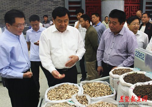 高登榜书记(左三)听取中药城介绍 【直报网5月28日讯】(康美药业)5月22日,芜湖市委书记、市人大常委会主任高登榜在亳州市委书记、市人大常委会主任杨敬农的陪同下到康美(亳州)华佗国际中药城考察。