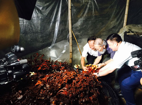 【直报网8月11日讯】(安惠)8月1日开始,国际著名蕈菌学家张树庭教授在江苏南通、上海、浙江杭州、龙泉等地拍摄祝贺其85华诞的电视专题片《蕈菌情缘 学术人生》。 8月9日,张树庭教授和摄制组来到杭州,在常青园的灵芝基地看到了一大片由数百株鹿角灵芝簇拥连体生长在一起,形成的直径超过1.8米,最高达90厘米的“灵芝大花圃”,这团灵芝重重叠叠生长在一起,仿佛一团热情的火焰,红红火火,代表着吉祥富贵与万事如意。据介绍,这团灵芝已经生长了三年,每逢冬天,主人会让它休眠,待到春天时,加以营养,让其顺势生长,才有了今天的壮美与华丽。张树庭教授非常高兴看到这团灵芝,并合影留念。 《蕈菌情缘 学术人生》庆祝张树庭教授85华诞的专题片主要描写了张教授治学严谨,潜心55载,足迹世界五大洲的学术人生,以及他的蘑菇情结、中国情结和农村情结。本片将于9月,张树庭教授学术思想国际研讨会召开前完成。