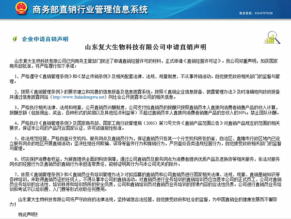 山东复大生物科技有限公司申请直销牌照的声明 【直报网10月13日讯】(商务部)公司简介: 山东复大生物科技有限公司隶属于复大生物集团,于2008年9月15日破土动工,用地面积达50多亩,是一家集科研、开发、生产、营销生物保健品、美容化妆品、消毒产品为一体的大型生产科研基地,已全面通过国家GMP标准论证。▲ 责任编辑:婉婉 解读新闻热点、呈现敏感事件、更多独家分析,尽在直销报道网微信,扫描二维码免费阅读。