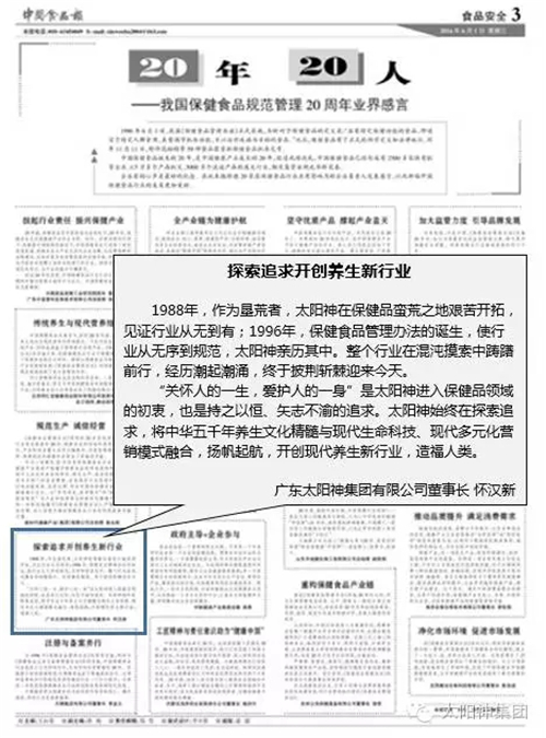 【直报网北京6月6日讯】(太阳神)近日,为纪念《保健食品管理办法》(以下简称《办法》)颁布20年,《中国食品报》策划“20年20人”专题,邀请了20家在保健食品行业极具影响力的企业负责人发表感言,祈福中国保健食品行业的未来更加美好。作为中国保健品行业的开拓者,太阳神集团董事长怀汉新先生也受邀发表致辞。 《保健食品管理办法》的正式实施,明确了中国保健食品的科学定义和法律地位,同时也规范了保健食品经营秩序,促使中国保健食品市场健康有序的发展。过去的20年里,中国保健食品已经形成有2500多家持有批号企业、1.5万多个产品批文、5000多个流通产品的庞大行业。 在纪念《办法》实施20周年的“20年20人”致辞中,怀董倾吐心声,“1988年,作为垦荒者,太阳神在保健品蛮荒之地艰苦开拓,见证行业从无到有;1996年,保健食品管理办法的诞生,行业从无序到规范,太阳神亲历其中”,太阳神将不忘“关怀人的一生,爱护人的一身”企业使命,开创现代养生新行业。 未来,太阳神集团将继续探索追求,将中华五千年养生文化精髓与现代生命科技、现代多元化营销模式融合,发展现代养生,造福人类。▲ (原标题:太阳神受邀为《保健食品管理办法》实施20周年致辞) 责任编辑:晨枫 解读新闻热点、呈现敏感事件、更多独家分析,尽在“直事儿”微信,扫描二维码免费阅读。