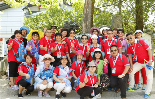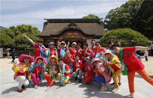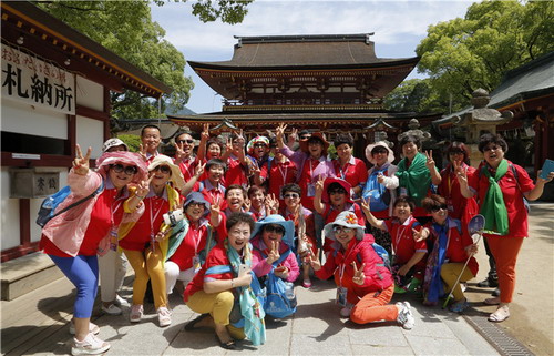 许多当地的日本居民,对于身着红色文化衫的太阳神人的到来,都纷纷显示出了极大的欢迎,并为伙伴们积极、热情的内心所感染,一一合影留念。 感受了太宰府悠久的历史文化韵味,伙伴们又来到日本海滨之最—福冈塔。福冈塔高234米,位处福冈滨海港湾,周围不仅有浪漫的沙滩,还有惬意的餐厅,可谓一个休闲观光的好去处,而由8000多片半反射镜覆盖着的塔身,不论是白天还是夜晚都散发着光亮,映射出福冈的美丽街景。