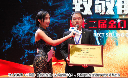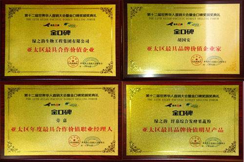 “金口碑”奖在业界有着崇高地位,更被誉为世界华人直销领域的“奥斯卡”,是社会经济文明进步的助推器。7日晚上,本届大会最受人瞩目的“金口碑”奖全部精彩落地,绿之韵集团荣获“亚太区最具合作价值企业”大奖,绿之韵集团董事长胡国安获得“亚太区最具品牌价值企业家”、绿之韵集团董事执行总裁劳嘉获得“亚太区年度最具合作价值职业经理人”,绿之韵纤慕综合发酵果蔬粉获得“亚太区最具品牌价值明星产品”奖项。