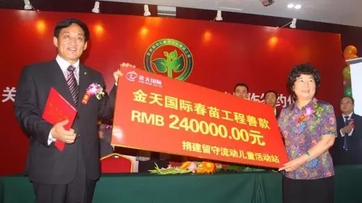 2012年9月,金天国际携手山东省妇联共同举办 “春苗工程”战略合作签约仪式。捐建百所留守儿童活动站,为留守儿童提供生活上的救助,精神上的关怀,学习上的帮助,让他们体会到了“社会大家庭”带来的温暖。 |