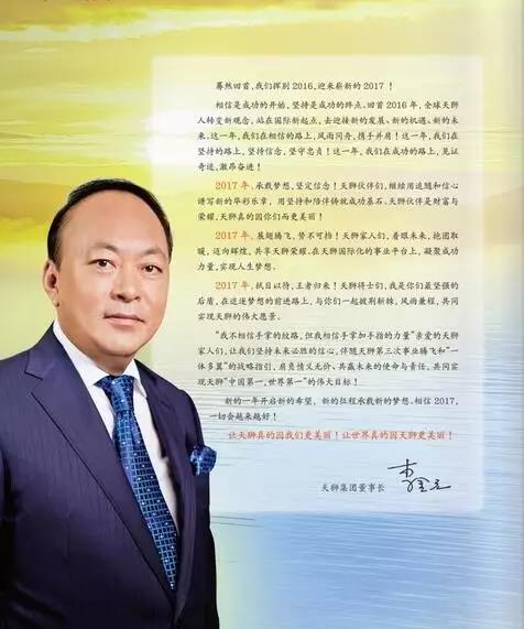 ![]() 蓦然回首,我们挥别2016,迎来崭新的2017! 相信是成功的开始,坚持是成功的终点。回首2016年,全球天狮人转变新观念,站在国际新起点,去迎接新的发展、新的机遇、新的未来。这一年,我们在相信的路上,风雨同舟,携手并肩!这一年,我们在坚持的路上,坚持信念,坚守忠贞!这一年,我们在成功的路上,见证奇迹,激昂奋进! 2017年,承载梦想,坚定信念!天狮伙伴们,继续用追随和信心谱写新的华彩乐章,用坚持和陪伴铸就成功基石。天狮伙伴是财富与荣耀,天狮真的因你们而更美丽! 2017年,展翅腾飞,势不可挡!天狮家人们,着眼未来,抱团取暖,迈向辉煌,共享天狮荣耀,在天狮国际化的事业平台上,凝聚成功力量,实现人生梦想。 2017年,拭目以待,王者归来!天狮将士们,我是你们最坚强的后盾,在追逐梦想的前进路上,与你们一起披荆斩棘,风雨兼程,共同实现天狮的伟大愿景。 “我不相信手掌的纹路,但我相信手掌加手指的力量”亲爱的天狮家人们,让我们坚持未来必胜的信心,伴随天狮第三次事业腾飞和“一体多翼”的战略指引,肩负情义无价、共贏未来的使命与责任,共同实现天狮”中国第一,世界第一”的伟大目标! 新的一年开启新的希望,新的征程承载新的梦想,相信2017,一切会越来越好!