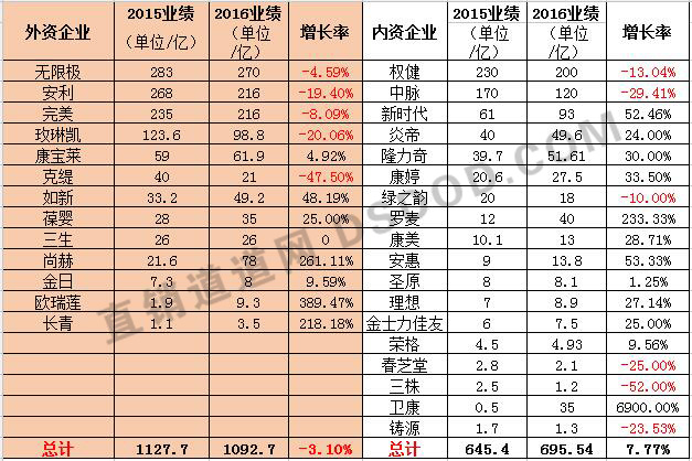 【直报网北京1月18日讯】(道道舆情)2016,是中国经济增速放缓的一年,也是直销行业备受考验的一年。在这一年里,无论是直销企业数量不断增加,各种资金盘,虚拟币,微商等因素影响,还是直销监管部门对直销行业以监管为导向,转向促进直销产业发展与严厉打击各类传销并驾齐驱等利好因素的出现,直销行业正在不断发生着变化。 据道道舆情监控室和第三方数据机构海伦国际直销研究中心共同发布的《2016年中国直销企业业绩报告》显示,44家企业的业绩总额超1920.14亿,与去年同比略有回落,其中,无限极再度蝉联冠军,安利与完美并列位居第二,佳莱,卫康等黑马频出。 一、2016年中国直销业绩排行榜(持续更新中......) ![]() ![]() 备注: ①本表统计的业绩数据来源于多个渠道的综合,包括各大直销企业自报、上市直销企业公告、以及企业市场经营状况估算等......数据仅供参考! ②本表中的“业绩”指80家商务部公示的直销企业2016年1月—12月直销板块在中国内地的业绩,且部分业绩是企业目前统计的大致数据,如与企业最后的精准业绩数值有差异,请以企业为准。 ③哈药集团直销业务全面叫停,爱茉莉中国区直销业务基本停顿,不纳入统计。 ④考虑到目前部分企业的业绩数据暂未统计公布,对此道道舆情监控室会持续监控、不断更新,更多数据请期待下期更新。若对数据有疑问,欢迎广大读者来电来函沟通、咨询。 ⑤统计数据仅为44家企业,2016年业绩不明确的企业暂未包含在内。 二、2016年度直销企业业绩超1920.14亿 增速放缓呈现新常态 根据商务部直销行业信息管理系统数据统计显示,截至2017年1月15日,我国共有80家企业正式获得直销经营许可证,他们在2016年创造了超过1920.14亿元的业绩。 无限极继2015年后,2016年再度以270亿的成绩荣登“业绩冠军”宝座,2015年屈居第二的安利在2016年只取得216亿的业绩,与完美并列第二,权健和中脉则分列以170亿和120亿紧随其后。 ![]() 1、增速放缓是行业范围调整的一种震荡 从录得的44家直销企业业绩来看,2016年直销行业整体业绩呈现增速放缓的新常态,尤其是2015年位居业绩排行榜前六的无限极、安利、完美、权健、中脉和玫琳凯等直销企业,他们的业绩无一例外地在2016年出现不同程度下滑。 对此,行业多位资深专家认为,直销行业在今年增速放缓不会成为一种趋势,而是行业范围调整的一种震荡。据统计,除去2015年业绩不明确的13家企业外,剩余的31家企业中,有11家企业的业绩出现下滑,有1家企业的业绩与去年持平,但也有19家企业的业绩保持着增长态势,甚至有增长率超过6900%的企业,整个行业仍在飞速发展。 ![]() 2、外资企业业绩仍领跑,内资企业迎头赶上 ![]() 从现有的数据来看,受无限极、安利、完美等传统老牌外资企业业绩下滑影响,2016年外资企业总业绩为1092.7亿,较去年业绩下滑3.10%;至于内资企业,2016年总业绩达695.54亿,总增长率为7.77%。从近两年的业绩数据分析中可以看到,虽然目前中国直销业绩仍是外资巨头领跑,但内资企业正逐步迎头赶上,尤其是随着内资企业获牌数量的不断增多,相信未来的差距将会进一步缩小。 三、增长仍是大趋势 多家直企业绩发力 2016年,直企业绩增长仍是大趋势。与2015年的业绩相比,有19家企业业绩都有不同幅度的增长。从增长率来看,有12家企业实现50%以内的业绩增长,2家企业实现了50%~100%的增长,尚赫、罗麦、卫康、欧瑞莲、长青等5家企业的业绩增长率超过100%,成为2016年度的“业绩增速五虎”。 ![]()