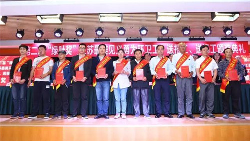 伴随着激昂的运动员进行曲,荣获表彰的24名获奖个人和4个获奖群体,依次登台接受主席台领导和组委会成员颁发荣誉证书和奖品。 获奖个人代表无锡市惠山区钱桥街道环卫所环卫工丁军、获奖群体代表如东县中通快递公司投递员冯鑫先后登台发言。