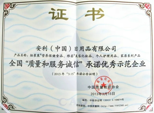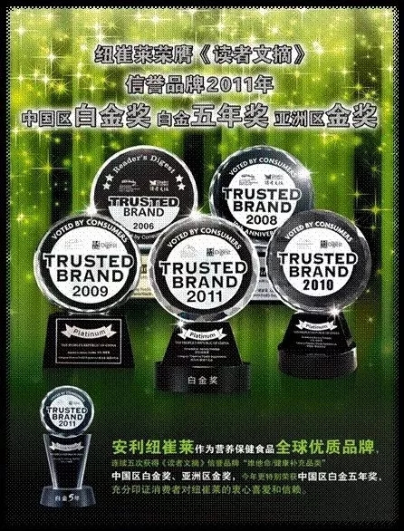 07 2013年3月15日 全国"质量和服务诚信"承诺优秀示范企业 ![]() 在中国质量检验协会组织开展的2013年"3•15质量和服务诚信承诺"专题活动中,安利凭借以质量立信的一贯宗旨与实际行动,荣获"质量和服务诚信"承诺优秀示范企业称号,同时获奖的还有宝马、三星、佳能等企业。 08 2011年 "维他命/健康补充品类"中国区白金奖 ![]() ![]() 09 “2008第一品牌评选” 纽崔莱品牌荣获三项大奖 在由腾讯网、中华品牌网、中华品牌战略研究院联合主办的“2008第一品牌评选”中,纽崔莱品牌获“年度最佳服务品牌”、“年度最佳营养品牌”、“男士保健品类品牌价值年度第一”三个奖项。 10 “2007中国健康年度总评榜” 最受欢迎保健品首位 由国内最权威的健康类网站之一的39健康网主办、新浪网联合评选的“2007中国健康年度总评榜”中,纽崔莱品牌和“安利纽崔莱健康跑”双双获奖,分别入选“最受欢迎保健品”、“最受欢迎健康活动”奖项,其中,纽崔莱位列“最受欢迎保健品”榜首。 与此同时,纽崔莱还获得多项重量级媒体奖项。1月,在由《北京晚报》主办的“2007年度最受百姓信赖的健康品牌”评选活动中,纽崔莱品牌蝉联“年度最受百姓信赖的健康品牌”。 11 2006年纽崔莱获得HACCP认证 2009年升级为ISO22000:2005 ![]()