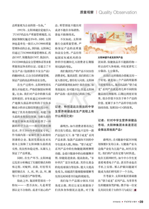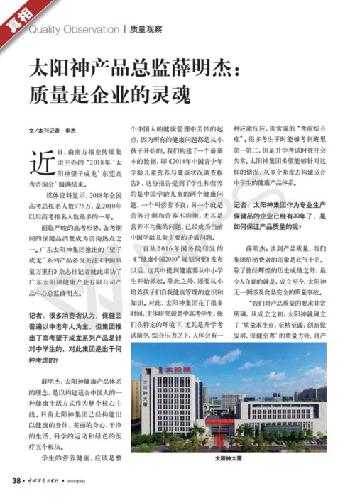 导读: 【直报网北京6月6日讯】(太阳神)五月,太阳神重磅推出“望子成龙”系列产品,为广大学子加油助阵,在市场引起了强烈反响。各地区精彩线下活动如火如荼开展,优质产品广受消费者喜爱,太阳神关注高考、以实际行动服务学生家长的举措,也引起媒体广泛关注。 ![]() 《南方日报》报道“望子成龙”活动 “望子成龙”系列产品助战学子升考 今年升学考试前夕,全国提前进入“烧烤”模式,大部分地区迎来高温。为帮助广大学生增强体质、补充营养,以更好的状态迎接考试,太阳神重磅推出“望子成龙”系列产品。 ![]() “望子成龙”系列产品通过“生物健口服液+金菇口服液+多补钙片+越清片”精妙组合,系统解决学生考前容易遇到的各类问题,一经推出,深受学生家长喜爱,市场好评如潮。由此也引发媒体关注。 太阳神冠名高考咨询会、服务学生和家长 5月19日,2018太阳神东莞高考咨询会宏远酒店举行,行业专家、知名院校领导莅临活动现场与学生家长面对面交流,将最新招生政策、志愿填报技巧送到家长和孩子手上。这是太阳神携手《南方日报》举办的一场专门服务于高考生及家长的咨询会。 ![]() 5月27号,广东南方报业集团举办的广州高招会上,再次出现太阳神的身影,“望子成龙”系列产品在活动现场受到了各界人士的好评,也勾起了老一辈人对太阳神30年老品牌的回忆。 ![]() 《中国质量万里行》 :质量是企业的灵魂 为什么太阳神“望子成龙”系列产品一经推出,就受到广大学生家长的认可呢?《中国质量万里行》通过采访太阳神健康产业产品总监薛明杰,于六月刊发布《质量是企业的灵魂》专题报道,揭晓了其中的答案。 ![]() ![]() 作为中国保健品行业的开创者,太阳神的产品信誉源于30年的深厚积淀,夯实于一代又又一代太阳神人的不懈努力。从成立之初,太阳神就确立了“质量求生存,至精至诚;创新促发展,保健至尊”的质量方针,将产品质量视为企业的第一方针。 太阳神30年的信誉积淀,吸引了数以亿计的忠实消费者,也成就了其自身优质的品牌形象。