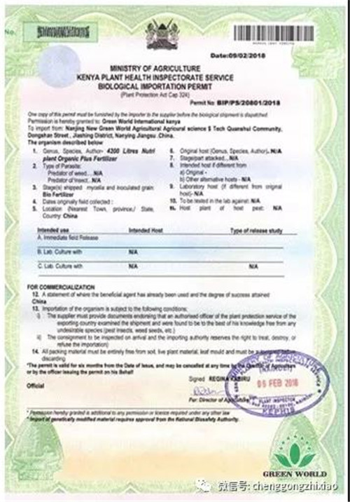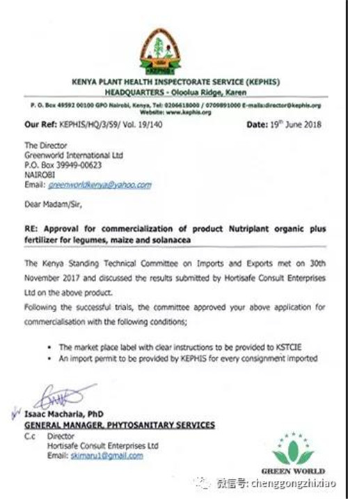 ![]() 沃德绿世界总裁李德明博士与南京农业大学资环学院副校长、博士生导师沈其荣教授(左一)及来自海外的专家进行植物营养因子的研讨 ![]() 南京农业大学资环学院副校长、博士生导师沈其荣教授(左三)与沃德绿世界总裁李德明博士、副总裁兼非洲区域总裁张良军先生、副总裁兼欧亚区域总裁陈延国先生考察有机肥料生产加工厂 【直报网北京7月4日讯】(沃德)2018年6月19日,沃德绿世界植物营养因子喜获肯尼亚农业部植物健康检查厅颁发的进口及销售许可证。在经过了4次分别由肯尼亚农业部植物健康检查厅及肯尼亚农业部主持的技术答辩之后,通过近一年与肯尼亚著名高等学府——JOMO KENYATTA大学合作进行的多种作物的农田实验,肯尼亚农业部认为绿世界植物营养因子对于豆类、玉米、茄科蔬菜等农作物生长具有良好的促进作用。这一具有里程碑意义的事件标志着沃德绿世界植物营养因子在具有东非桥头堡之称的肯尼亚获得了政府的认可及首肯。 沃德绿世界将世界顶级有机肥料专家--南京农业大学副校长沈其荣教授的一项重要研究成果转化为应用于农业生产、土壤改良、环境保护、提高农作物产量的产品——植物营养因子。该产品在非洲的主要农业大国获得了政府部门、广大农民、农产品经销商的高度认可,被认为是改善土壤肥力和土壤生态环境、提高作物产量和质量的纯天然、零污染、高活性的有机肥产品。沃德绿世界植物营养因子已经在西非尼日利亚、东非肯尼亚获得了农业部的认可,并正在迅速走进这两个国家的耕地田间。在2017年9月14日肯尼亚Nyeri市召开的肯尼亚国家中部地区展览会上,肯尼亚总统Uhuru Kenyatta先生对沃德绿世界的植物营养因子给予了高度重视。在南非,植物营养因子也引起了当地传统部落领袖祖鲁国王家族的高度重视,这个德高望重的家族的代表表示了与沃德绿世界公司就植物营养因子在南非的应用推广方面的合作意向。 当前,大多数国家面临着人口膨胀、过度耕种、土壤退化、污染日益严重的挑战,继沃德绿世界的营养保健品系列之后,植物营养因子势必将再一次为提升广大民众的健康和福祉做出更大的贡献。 ![]() 在2017年9月14日肯尼亚Nyeri市召开的肯尼亚国家中部地区展览会上,肯尼亚总统Uhuru Kenyatta先生对沃德绿世界的植物营养因子给予了高度重视 ![]() 肯尼亚农业部植物健康检查厅颁发的绿世界植物营养因子销售许可证 ![]() 肯尼亚农业部植物健康检查厅颁发的绿世界植物营养因子进口许可证 (原标题:沃德绿世界植物营养因子喜获肯尼亚农业部颁发的进口及销售许可) 责任编辑:小宇 解读新闻热点、呈现敏感事件、更多独家分析,尽在以下微信公号,扫描二维码免费阅读。