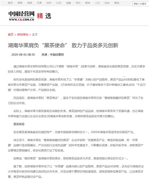 中国经营网:湖南华莱肩负“黑茶使命”致力于品类多元创新 【直报网北京8月11日讯】(中国经营网)通过湖南华莱生物科技有限公司(以下简称“湖南华莱”)探索与创新,湖南省安化县的黑茶资源,正在为更多的世人所知,展现千年茶史所特有的魅力。 依托安化县独特的黑茶资源,湖南华莱形成了以“华莱健”为核心的产品格局,黑茶产品达60多款;建成了湖南华莱冷市黑茶产业园、万隆黑茶产业园、3万亩有机生态茶园、叶子基地等多个茶叶种植加工基地;启动“千店万铺”代理加盟商户计划,产品销往全国。 而这背后,是湖南华莱的“黑茶使命”,诞生于安化县的湖南华莱早已将“要做就做最好的黑茶”列为了自己的企业宗旨。 实际上,湖南华莱与黑茶是相互成就的关系。黑茶独特的产品品类,给湖南华莱带来了发展机遇,也让湖南华莱有能力去践行企业社会责任;而湖南华莱创新发展,也帮助黑茶品类走向更大的舞台。 黑茶使命 安化黑茶是湖南省安化县的特产,也是中国国家地理标志之一。2009年湖南华莱进军安化黑茶产业。 成立至今,湖南华莱在“要做就做最好的黑茶”企业宗旨和“发展黑茶产业,铸造民族品牌,把‘华莱健’品牌打造成规模化、产业化的行业领先品牌”的科学发展观下,不断整合资源,积极开拓市场,创新黑茶产业管理及营销模式,将安化黑茶打出了知名度。 如果说“做好黑茶”是湖南华莱的使命,那将黑茶品类多元开发,就是其践行使命的方式之一。 据了解,目前湖南华莱形成了以“华莱健”品牌为核心的产品格局,黑茶产品达60多款,还先后与湖南农业大学等茶叶研究机构建立良好的合作关系,开发出便于携带饮用的速溶茶、袋泡茶等新型黑茶产品,以及黑茶牙膏、黑茶护肤品等衍生产品。 在2011年,华莱健“速溶黑茶”面世,以安化一级黑毛茶为原料,采用传统黑茶制作工艺,结合现代加工技术精制而成,由此拉开了千年黑茶变身“速溶咖啡”的序幕。 2013年,湖南华莱开始生产华莱健茯砖袋泡茶,通过精细碎化,洁净灭菌、提纯陈化、干燥成型等科技技术方法精制而成,方便饮用。同年,湖南华莱开始生产华莱健天尖袋泡黑茶,产品在品质和包装上,有随泡、便捷等特点,满足了人们快速冲泡,旅游出差等实际需要。 2018年,湖南华莱开始生产华莱健以黑茶为原料的护肤品系列产品。同年,湖南华莱生产黑茶牙膏。 湖南华莱副总经理曾卫军表示:“在新时代,我们必须用新的思路、新的方法、新的元素去经营产业。”无疑,湖南华莱正在为黑茶产业,打造了一张又一张的新名片,走上了更多更大的舞台。 科研引擎 对黑茶的开发,离不开科研的投入。湖南华莱董事长陈社强曾表示,科研,是湖南华莱谋求创新发展的强大引擎,也是企业“做大、做强、做优”的核心动力。 实际上,自成立之初湖南华莱即确立了“以科技带动产业链,以科技带动产品的更新,以科技带动销售和加盟体系”的产品开发战略,并先后与湖南农业大学、国际茶学界专家刘仲华教授、施兆鹏教授建立了良好的合作关系,研发生产多种新型黑茶深加工产品。 同时,公司还积极加强内部建设,不断夯实根基,现已建成万隆黑茶产业园、冷市黑茶产业园、叶子基地、水龙茶园等多个高标准、高规格的茶叶种植生产加工基地。其中,湖南华莱产品研发中心(质量检测中心)、万隆GMP黑茶深加工生产车间、冷市GMP保健食品生产车间等多个车间都已投入使用。 其中万隆GMP黑茶深加工生产车间依照十万级净化车间标准,拥有四条全自动化、标准化、清洁化的生产线,包括茯砖袋泡茶生产线、天尖袋泡茶生产线、速溶黑茶生产线和茶叶全自动包装生产线。 湖南华莱产品研发中心(质量检测中心)引入国外研发企业的现代化设计和管理理念,建成了无菌准备室、培养室、精密仪器室等多个高科技实验室的硬件设施及研发体系,拥有全套的研究试验设施和完善的科研职能部门。该检测中心已于2019年7月挂牌成为安化黑茶质量检验检测中心。 曾卫军表示:“华莱不仅要做好传统的安化黑茶,同时也要做好与国际接轨的黑茶衍生产品。所以,我们作为安化黑茶产业发展的中坚力量,承担着助力黑茶产业全面发展的使命,而在新时代,我们必须用新的思路、新的方法、新的元素去经营产业。” 文化兴茶 产品创新、科技研发之外,湖南华莱还是黑茶文化的继承者和传承者。湖南华莱的企业愿景,便是成为弘扬中国茶道文化和极具创新能力的全球领先企业。其“治茶以德,兴茶以义,诚信立足,创新致远”的企业价值观,也与黑茶有着千丝万缕的联系。 依托得天独厚的黑茶资源和黑茶文化,将现代旅游业发展的形态融入到产业发展的大局之中,已形成独具特色的茶旅文一体化产业格局。在湖南华莱的各个茶园基地、生产基地,每天都演绎着与安化黑茶相关的人文故事。截至目前,湖南华莱已建成冷市黑茶产业园、万隆黑茶产业园、叶子基地等三个大型茶文化主题产业园,拥有江南茶园基地、水龙茶园、叶子茶园等共计3万亩生态茶园,年生产销售黑茶达5.5万吨。 正在打造的“安化黑茶特色小镇”项目,更是投入近百亿元,计划用5年时间,打造安化黑茶文化广场、资江水上旅游、大酉溪旅游、江南水乡旅游、黄沙坪古茶市、唐家观古镇、钟鼓山观光茶园、鲇鱼洲综合开发、华莱国际、黑茶大市场、滨江新城、酉洲