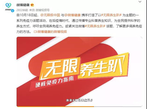 【直报网北京11月29日讯】(无限极)自10月18日起,无限极与新浪微博健康频道携手打造了以#无限养生趴#为主题的一系列免疫力话题活动,在后疫情时代,通过传播专业科普养生知识,为全民提供科学的养生方式,呼吁全民调养免疫力。 01 多方力量齐助力 全民养生新征程 ![]() 养生这面大旗不是只有中年人扛着,年轻人早已将它扛在肩上。曾经刷爆全网的朋克养生90后、00后已摇身一变成了真正的C位养生达人。 ![]() #无限养生趴#微博话题页截图 ![]() ![]() 微博健康发文截图 此次的#无限养生趴#话题活动中,微博健康频道作为首发博主,邀请平台权威专家、微博头部养生达人共同分享“调养免疫力”养生知识。截至目前,#无限养生趴#的微博话题总曝光量已超10亿,话题阅读量破3.7亿,互动量近300万,累计发布博文超1.6万条。 无限极中国官方微博和网友们一起深挖因免疫力下降造成的各类健康问题,极大地吸引了公众的兴趣,同时也提升了大众的健康意识。 02 发起调养计划 倡导从根本调养免疫力 ![]() 在这场全民抗“疫”战中,健康是大家永恒的话题。没有健康,一切都是“0”。自#无限养生趴#话题活动上线以来,“养生”“免疫力”“健康”“营养”成为了本次话题的热门关键词,反复被网友提及。 无限极作为健康产业的一员,积极地向大众推广“养生固本健康人生”的健康理念。自2014年起,无限极提出“调养根本免疫增健”的调养观念,并开启一系列的“调养计划”:要改善亚健康状况,提升身体免疫力,必须得靠全方位及从根本上的调养。 生活中坚持做到饮食、起居、运动、情志的“四合理”,注重正气、阴阳、脏腑的“三调养”,是“养”出健康的良方。 03 调养免疫力 无限极一直在努力