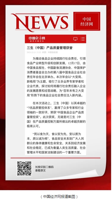 作为宁波市首批参与“浙食链”的企业之一,公司开发了智能化、信息化的产品身份识别系统,做到产品的每一个环节都有源可溯。三生“浙食链”的应用,可以方便消费者通过扫描二维码就了解包括产品原料、原料的批号、生产过程、检验报告等信息在内的信息。 始终如一地坚持高标准、严要求,严格的产品质量管控也为三生获得了诸多的荣誉,从2011年开始,已经连续11年在中国食品安全大会上获得“中国食品安全十强企业”。 食品安全没有最好,只有更好,未来,三生(中国)将继续以高度的社会责任感和使命感,一如既往地坚守食品安全阵地,坚定不移地践行“健康中国”战略,不断提高对食品安全的重视与投入,做健康中国的推动者和实践者,为用户提供更多、更安全的健康产品,为不断增强全民食品安全意识、提升我国食品安全总体水平贡献应有的力量。 媒体报道