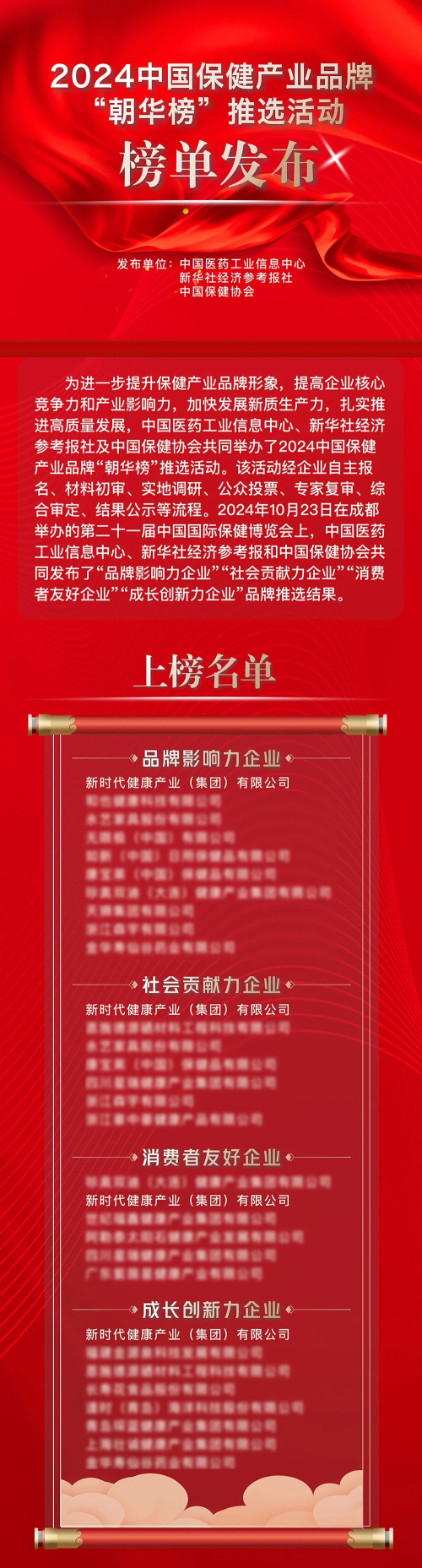 ![]() 【直报网北京11月6日讯】(新时代)10月23日,2024中国保健产业展望大会暨中国保健产业品牌“朝华榜”发布会在四川成都举办,公司成为一举收获“朝华榜”四项荣誉的唯一企业。这份荣耀有着怎样的含金量?又将把我们带向怎样的远方呢? 何为朝华? 此次榜单推选命名为“朝华榜”,“朝华”是木槿花的别称,木槿花有坚韧不屈,执着向上的精神,象征对美好事物的执着追求。 在“朝华榜”发布会现场,中国医药工业信息中心华雪蔚介绍了榜单推选的目标和意义。 ![]() 中国医药工业信息中心 华雪蔚 “朝华榜”榜单推选本着推优选树、宁缺毋滥的核心主张,凸显在保健领域具有显著影响力的品牌,提高企业核心竞争力和产业影响力, 为消费者提供参考依据,助力保健品产业能级跃升和高质量发展,推动健康经济持续向好发展。 “朝华榜”的含金量体现在哪? 行业影响力大 大健康产业在全面推进健康中国建设中扮演重要角色。随着人们健康意识的提升和生活水平的不断提高,消费者对健康产品及服务的需求日益增加,但产业发展仍存在瓶颈与挑战,尤其需要优秀的企业和品牌起到标杆示范作用带动行业高质量发展。 权威机构共促 “朝华榜”推选活动由新华社经济参考报社、新华社品牌工作办公室、中国医药工业信息中心以及中国保健协会共同开展。 新华社经济参考报 创刊于改革开放之初的1981年,是新中国第一份综合性经济报纸,由邓小平同志亲自题写报名并题词“开发信息资源,服务四化建设”,是国务院国资委和新华社合作搭建的全方位报道国资国企的重要平台,也是国务院证监会指定上市公司信息披露媒体。 新华社品牌工作办公室 是隶属于新华社的组织机构,致力于服务民族企业发展,助力中国品牌建设。 中国医药工业信息中心 组建于1958年,原名上海医药工业研究院信息中心145。其曾先后隶属化工部、国家医药管理总局、国家经贸委、国家发改委。自 2009 年起承担 “工业和信息化部医药工业信息中心” 职能至今。它是中国医药行业中历史最悠久、最具权威性、技术力量最雄厚的信息研究机构。 中国保健协会 成立于 2003 年,是由保健行业大中型企业为核心组成的机构,其宗旨是推动保健产业发展、加强国内外交流合作等,业务范围涵盖行业调研、活动举办、培训咨询等诸多方面。 评选标准严苛 报名企业经过中国医药工业信息中心初步审核→实地调研→公众投票→专家评审→结果综合审定→品牌公示等环节最终诞生。 8月20日-8月31日 信息核查 收到申请单位的申报材料后,由中国医药工业信息中心进行初步审核,对申报材料的完整性、资质的有效性等进行核查,筛选出符合参加推选的企业后形成初选名单,进入大众投票及专家评审环节。 7月21日-8月31日 实地调研 自本活动发布通知起,新华社品牌工作办公室、新华社经济参考报社及中国医药工业信息中心将对申报企业开展实地调研,对申报企业进行全方位的了解,并将调研情况报评审组。 9月1日-9月5日 公众投票 信息核查后形成的名单将在新华健康、医药地理、第一健康报道、中国保健协会官网、微信公众平台等多种渠道发布,确保投票结果的广泛性和代表性。 9月6日-9月15日 专家评审 由保健、医药、媒体、法律等领域的专家学者组成评审组,根据研究制定的科学、合理的品牌评审指标体系,综合考虑品牌知名度、市场占有率、消费者满意度、社会责任等多个维度的推选指标进行评审。 9月16日-10月10日 数据统计分析 评审组应对推选过程收集与调研的信息和相关资料进行汇总分析,并综合公众投票数据,计算每个品牌在各项指标上的得分。评审结束后,由评审组组长填写书面的《评审报告单》,给出经现场讨论后的一致性推选结果,评审组对报告内容的真实性、准确性负责。 10月11日-10月17日 品牌公示 根据各项指标得分,分别在保健食品、保健用品、保健服务细分领域各形成 4 个品牌榜单,并在新华健康、医药地理、第一健康报道、中国保健协会官网、公众号等平台公示。 商业价值高 知名度和美誉度是衡量品牌价值和竞争力的重要指标。“朝华榜”榜单将公布于新华健康、医药地理、第一健康报道等知名媒体以及中国保健协会官方网站,持续为获奖企业赋能。 ![]() “朝华榜”为大健康产业遴选出了一批质量体系建设完善、客户服务精准高效、创新模式成熟稳定、标准建立科学合理、社会责任履行扎实的企业标杆和典范。