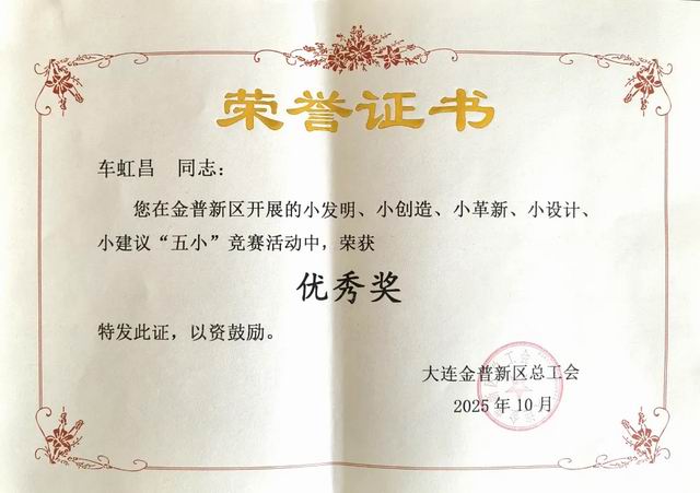 近日,从金普新区总工会传来喜讯,大连双迪科技股份有限公司(以下简称为:双迪股份)在2025年度“五小”创新成果评选活动中表现卓越,申报的四项成果全部获奖。其中设备管理部