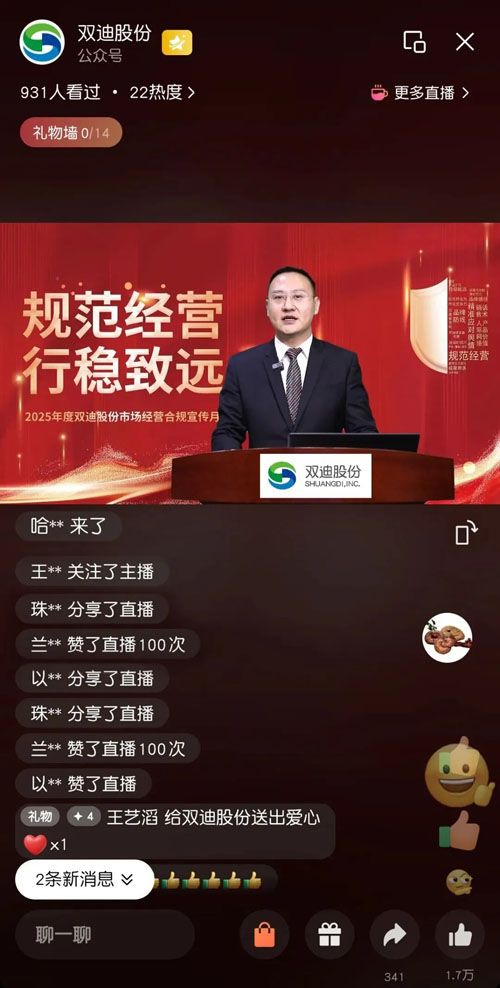 ![]() PART 04 多元传播:直播+视频,强化认知 10月17日,双迪外事部开展的《规范经营 行稳致远》主题直播,作为本次宣传月的线上核心阵地,取得了显著成效。单场直播即吸引近千人次观看,收获1.7万次点赞与超300次分享,充分体现了市场伙伴对合规知识的高度关注与认可。同时,在公司自媒体平台持续释出培训集锦、经销商宣言视频等多元化内容;双迪终端管理部深入解读经销商守则,多管齐下,将规范意识生动融入日常运营的每一个场景。 ![]() PART 05 终端发声:宣言为证,践行合规 各市场经销商积极参与合规宣言录制,以“不越红线、不踩底线”的承诺,展现一线从业者对双迪合规经营的认同与坚守。 回首为期月余的合规宣传月,我们欣喜地看到,以“合规筑基,共守底线”为核心理念的种子已深深植根于双迪的土壤:从启动仪式的庄严承诺,到六城培训的扎实落地;从成功胜诉的法律捍卫,到终端店铺的自觉践行,“人人讲合规、事事守规矩”的氛围日益浓厚,为市场经营筑起了一道坚实的“防火墙”。这不仅是一次阶段性的活动,更是双迪合规文化建设的新起点。