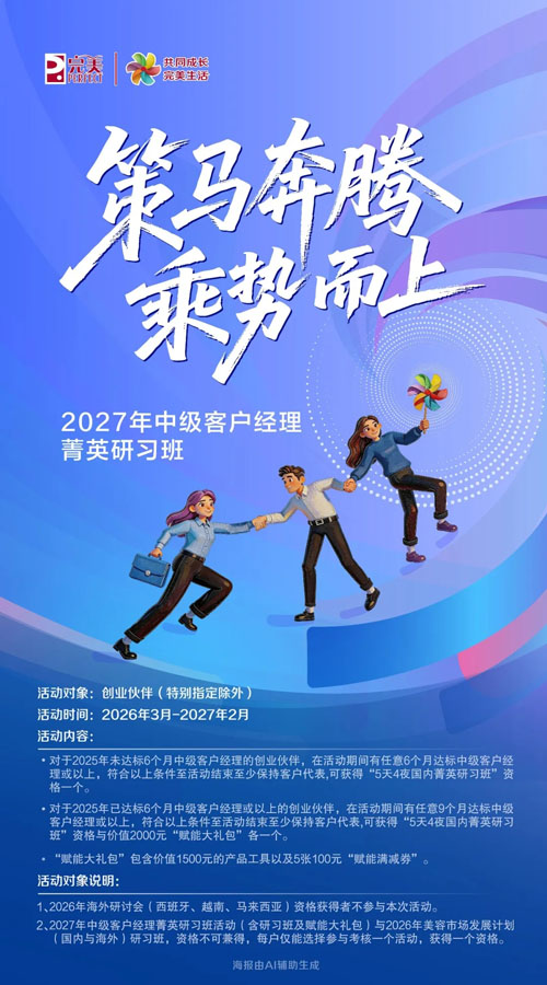 【直报网北京3月9日讯】(完美)策马奔腾,乘势而上;同共生,齐发展,2027年中级客户经理菁英研习班活动正式推出! 在这个充满生机与活力的时刻,让我们以山河为卷,以实干为笔,成就梦想,共筑完美的生态花园! ![]() 想了解更多活动详情? 一起往下看! 活动对象 创业伙伴(特别指定除外) 活动时间 2026年3月-2027年2月 活动内容 对于2025年未达标6个月中级客户经理的创业伙伴,在活动期间有任意6个月达标中级客户经理或以上,符合以上条件至活动结束至少保持客户代表,可获得“5天4夜国内菁英研习班”资格一个。 对于2025年已达标6个月中级客户经理或以上的创业伙伴,在活动期间有任意9个月达标中级客户经理或以上,符合以上条件至活动结束至少保持客户代表,可获得“5天4夜国内菁英研习班”资格与价值2000元“赋能大礼包”各一个。 “赋能大礼包”包含价值1500元的产品工具以及5张100元“赋能满减券”。 活动对象说明 1. 2026年海外研讨会(西班牙、越南、马来西亚)资格获得者不参与本次活动。 2. 2027年中级客户经理菁英研习班活动(含研习班及赋能大礼包)与2026年美容市场发展计划(国内与海外)研习班,资格不可兼得,每户仅能选择参与考核一个活动,获得一个资格。 关于【赋能大礼包】的说明 1. 赋能大礼包中价值1500元的产品工具内容,于2027年3月公布;达标创业伙伴,在兑换期内任意消费即可随单0元换购产品工具一份,过期失效,不再后补,届时请留意公司发出的邮件及短信或咨询当地分公司。 2. 赋能满减券共计5张,每张100元,单笔订单消费满1000元立减100元,减价不减积分。 3. 赋能满减券支持转赠与堆叠使用,例如:单笔消费满2000元立减200元、单笔订单消费满3000元立减300元。 4. 赋能满减券不可用于AG1002、丽龄礼遇换购活动、时光荟活动以及其他有特别说明的活动产品。 5. 关于产品工具与赋能满减券使用时效说明:产品工具兑换与赋能满减券使用期为2027年3月24日10:00-4月30日,逾期不用自动作废,不再补回。 关于【国内菁英研习班】的说明 1. 每个卡号仅参加1次考核,最多可获得1个达标资格,1卡1人出席。本人或配偶均可,配偶必须在收到邀请函的六个月前在公司登记资料,方能生效。若无,公司将保留最后是否邀请出行的权利。 2. 【资格不可转让】,在公司通知的出行时间内,如因个人原因不出席,资格过期失效,不退不补。 3. 【签到前、解散后】往返交通费、住宿费及个人消费等由顾客承担,出行期内团体活动费用由公司承担。具体的出行时间及安排,请留意公司通知。 4. 凡获得出行资格的创业伙伴,含有以下所列情况之一的,均需提供3个月内市级三甲医院出示的健康体检报告书,经公司确认身体无异常,健康状况可适合出行,方可参加活动,情况有: ①70周岁及以上者; ②有重大疾病者; ③有慢性病史者; ④出发前半年内进行过手术者; ⑤出发前怀孕者。 5. 国内菁英研习班的举办时间及地点视实际而定,公司将另行通知。