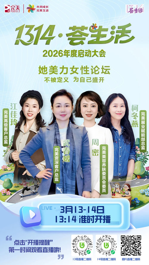 ![]() 她美力女性论坛:不被定义 为自己盛开 【直报网北京3月12日讯】(完美)全新栏目「她美力女性论坛」首期开讲!聚焦当代女性议题,邀请优秀女性代表,以对话碰撞智慧,以故事传递力量。在春日里,看见“她”的光彩,听见“她”的声音。 大咖好物分享:共同成长 相互滋养 完美资深客户总监陈俊华、杨秀丽将为您讲述如何用日常装下事业与生活的平衡,用真实写就有爱与有趣的答卷,让榜样的力量在“荟生活”中绽放,感染每一个相信并追求美好生活的您! 美容沙龙标杆案例:我们的趣美派对 完美美容养肤委员会委员赵娜娜,向大家解答如何将美容沙龙打造成有趣、有爱、有温度的社交场景,为您提供可参考的美容沙龙运营灵感,助力您打造有温度的沙龙。 她美力:科技养肤新趋势,打造完美新肌肤 完美展业赋能部经理罗一云将为您解析无创水光仪的原理与核心功效,并带来现场实操演示。从科技解读到手法教学,带您感受无创、舒适、高效的科技养肤新方式,解锁春日美肌的焕亮密码! 荟友趣·变有趣:展业达人趣变记 完美荟生活展业达人畅芳、周密、孙腾飞、曹硒媛倾情演绎,通过创意视频带您走进他们的展业日常,看他们如何应用“荟友趣”小程序见招拆招,让展业难题迎刃而解! 完美大舞台:见证高光时刻 从默默耕耘到绽放光彩,他们的每一步成长都值得被看见、被喝彩。首届完美大舞台颁奖典礼上,让我们共同见证属于完美人的高光时刻!这是荣誉的加冕,更是梦想的启航——下一个站上舞台的,会是您吗? 荟生活AI嘉年华:春日焕新,美好荟聚 三月是女性的节日,更是焕新的起点。 1314·荟生活2026年度启动大会中,荟生活AI嘉年华汇聚健康与美丽的多重精彩,为您打造一站式春日焕新体验! 福利狂欢:春日好礼,纷至沓来 成倩、王文通两大主播联袂主持,为直播间加码抽奖福利!完美宜悦空气净化器、弗雷佳酿红葡萄酒、德列宝汤锅、荟新舒活乳等大奖等您来拿!更有三月福利活动大放送,多重好礼,只等您来! 「直播预约」 3月13日-14日 每日13:14 准时开播