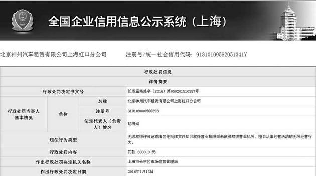 【直报网北京2月17日讯】(新浪科技)春节前后,涉及租车无照经营等案件数量增加。近日,北京神州汽车租赁有限公司上海虹口分公司因无照经营领到3000元罚单。此前,神州租车因未经登记冒用有限责任公司分公司名义开展经营活动,被北京市工商局昌平分局罚款1万元。 经查,神州租车自2014年1月起,在上海长宁路以“神州租车中山公园门店”名义对外从事汽车租赁经营活动。截至2016年1月5日停止经营活动,当事人并未取得营业执照。因当事人在经营过程中,未设经营账册,故其违法所得无法计算。 上海市长宁区市场监督管理局认为,当事人在未依法取得营业执照的情况下,擅自从事经营活动的行为,构成了《无照经营查处取缔办法》第四条第一款第(二)项所指的行为。该局根据《行政处罚法》第二十七条第一款第(一)项和《无照经营查处取缔办法》第十四条第一款的规定,对当事人作出行政处罚。▲ (原标题:神州租车分公司因无照经营被罚) 责编:米朵 解读新闻热点、呈现敏感事件、更多独家分析,尽在“直事儿”微信,扫描二维码免费阅读。